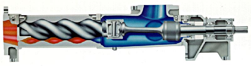 首先,該螺桿泵是一種內(nèi)嚙合回轉(zhuǎn)式容積泵,當(dāng)單線螺旋的轉(zhuǎn)子在雙線的螺旋的定子孔內(nèi)繞定子軸線作行星回轉(zhuǎn)時(shí),轉(zhuǎn)子一一定子付之間形成的密閉腔就連續(xù)的、勻速的、容積不變的將介質(zhì)從吸入端輸送到輸出端。